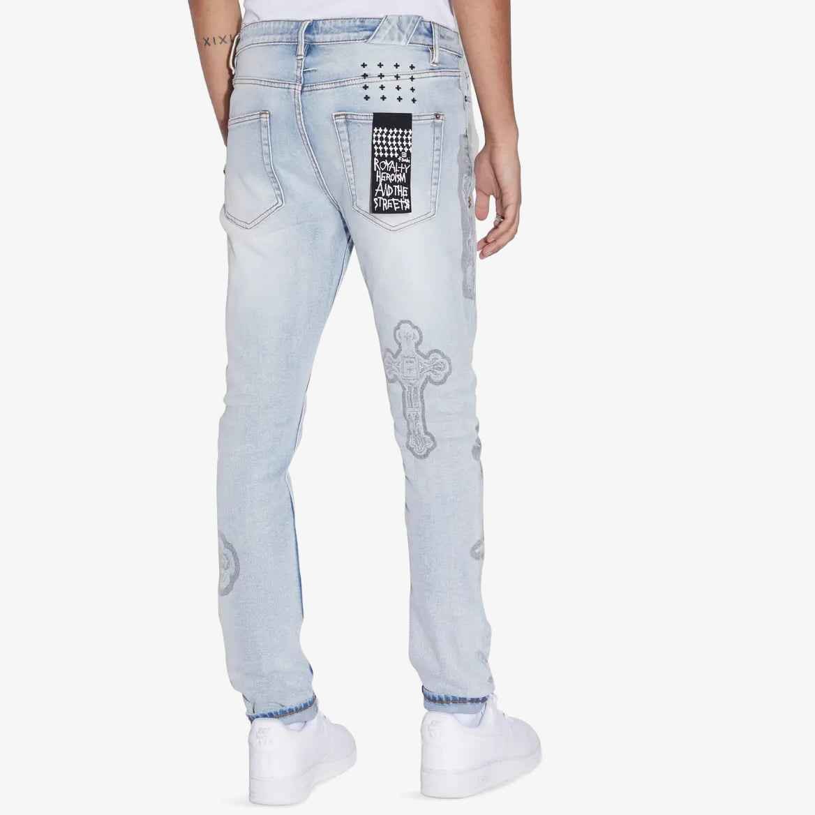 Bleach-baked jeans are cut from premium stretch-kissed denim and graced with gritty branding and dreamy smash prints.