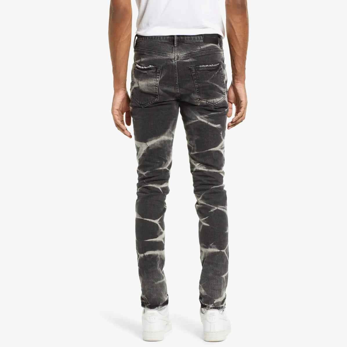 - Rings of bleachy tie-dye ripple up the legs of faded-black jeans sporting threadbare nicks and scuffs and a skinny, contour-hugging fit.