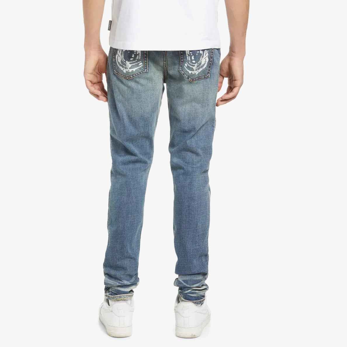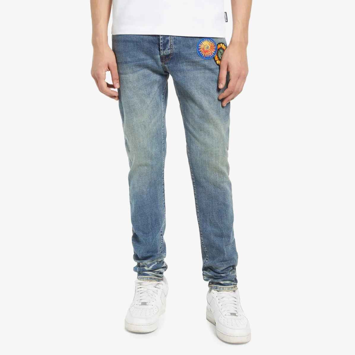 - Bold patches and whiskering cover medium wash jeans with a straight-leg fit that goes well with every one of your streetwear looks.