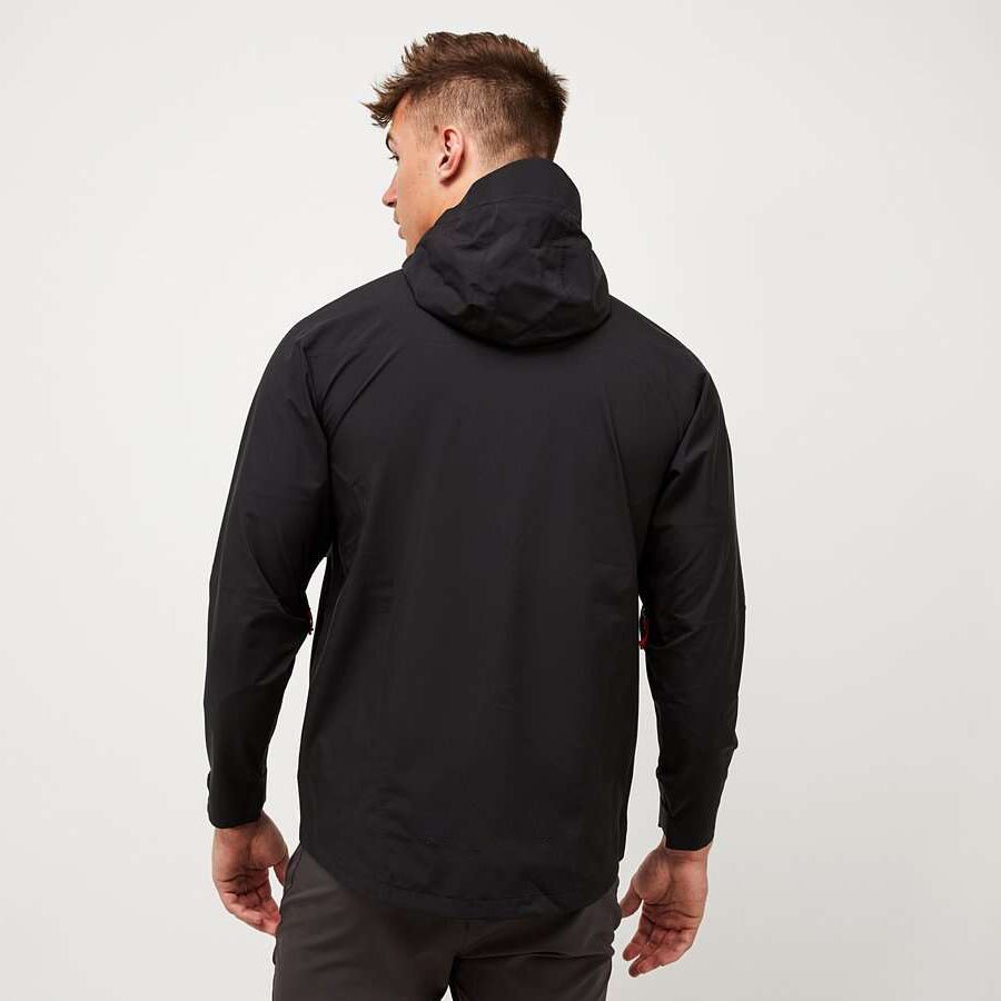 Monterrain Torrent Waterproof Shell Jacket in Black and Red. Showerproof and adaptable this lightweight shell jacket is perfect for wear in wet weather conditions. Featuring a breathable yet waterproof fabric, and a constructed hood for added coverage. A shaped reverse hem drops lower for a performance fit, zipped pockets to side, hook and loop sleeves and reflective prints for added visibility.